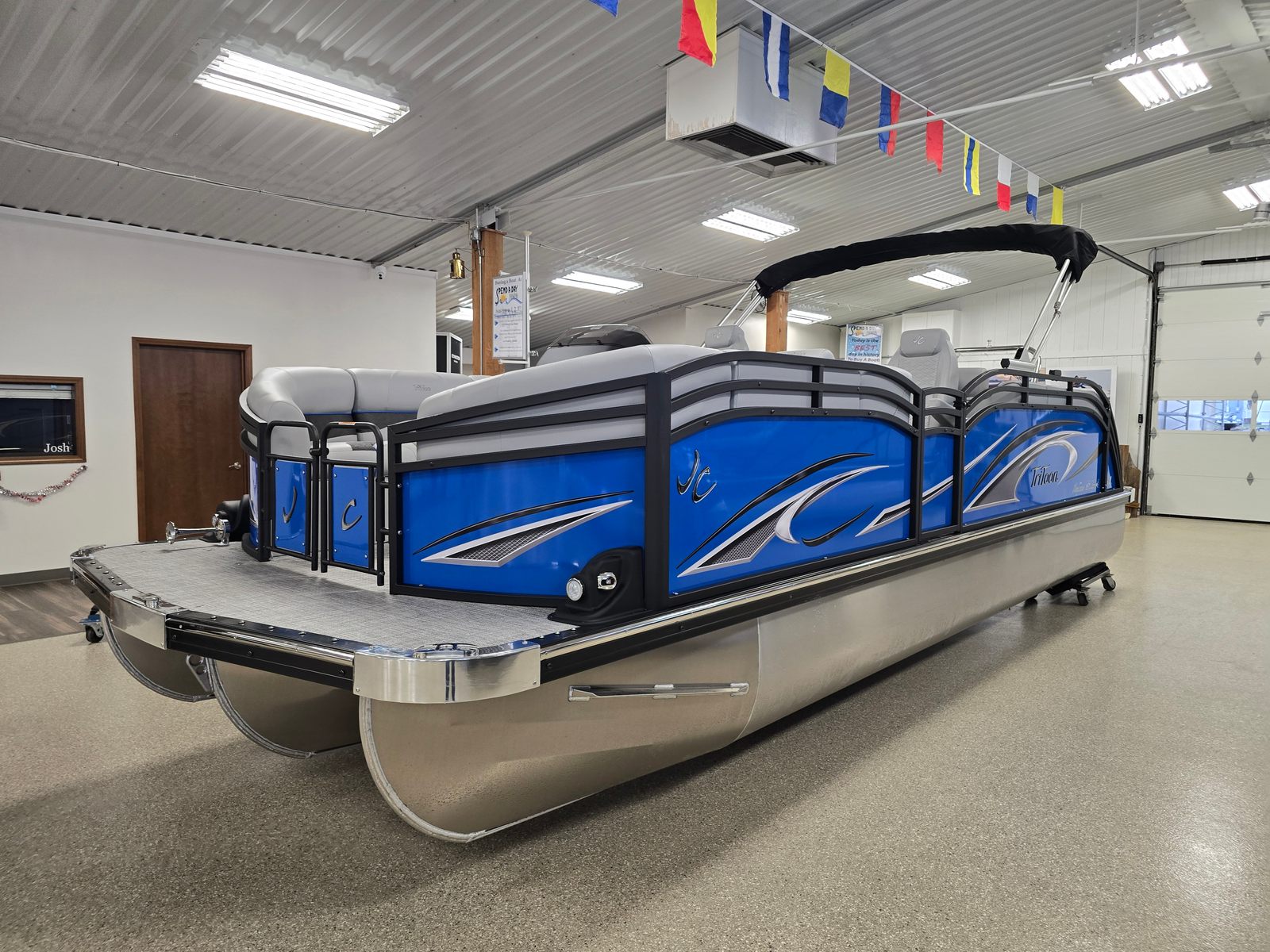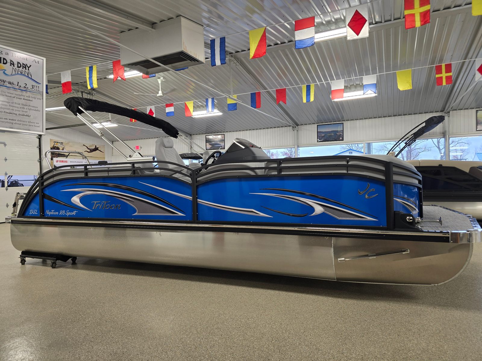 The 2026 Jc Neptoon 23TT Sport Pontoon stands out with its impressive 23-foot length, offering ample space for entertaining and unwinding. As a new model, it showcases the latest innovations in pontoon design, ensuring you enjoy a modern boating experience with every outing. The sleek graphics in light blue and black, complemented by a matching panel color, give this pontoon a contemporary and eye-catching look that will turn heads at any marina or lake.