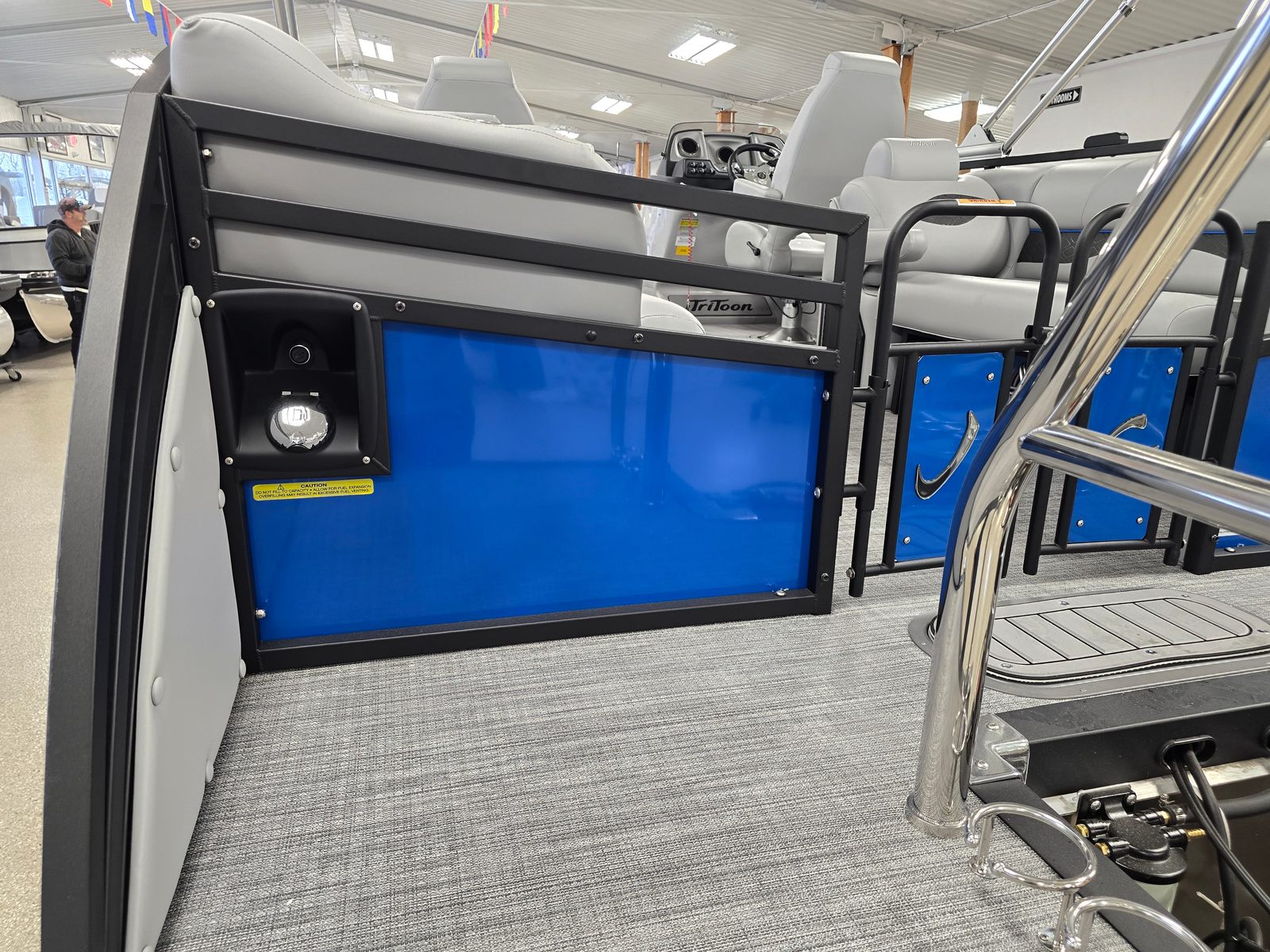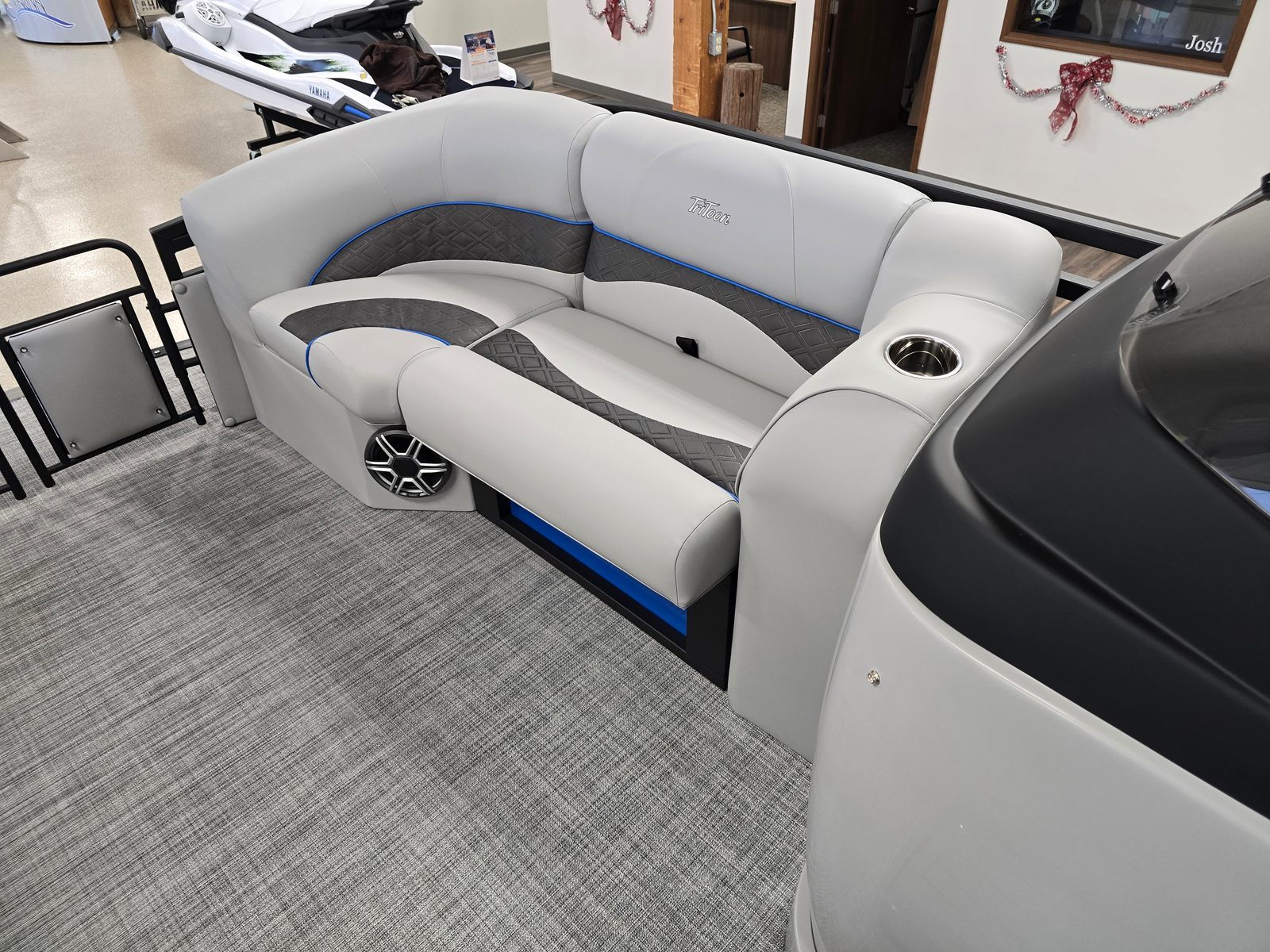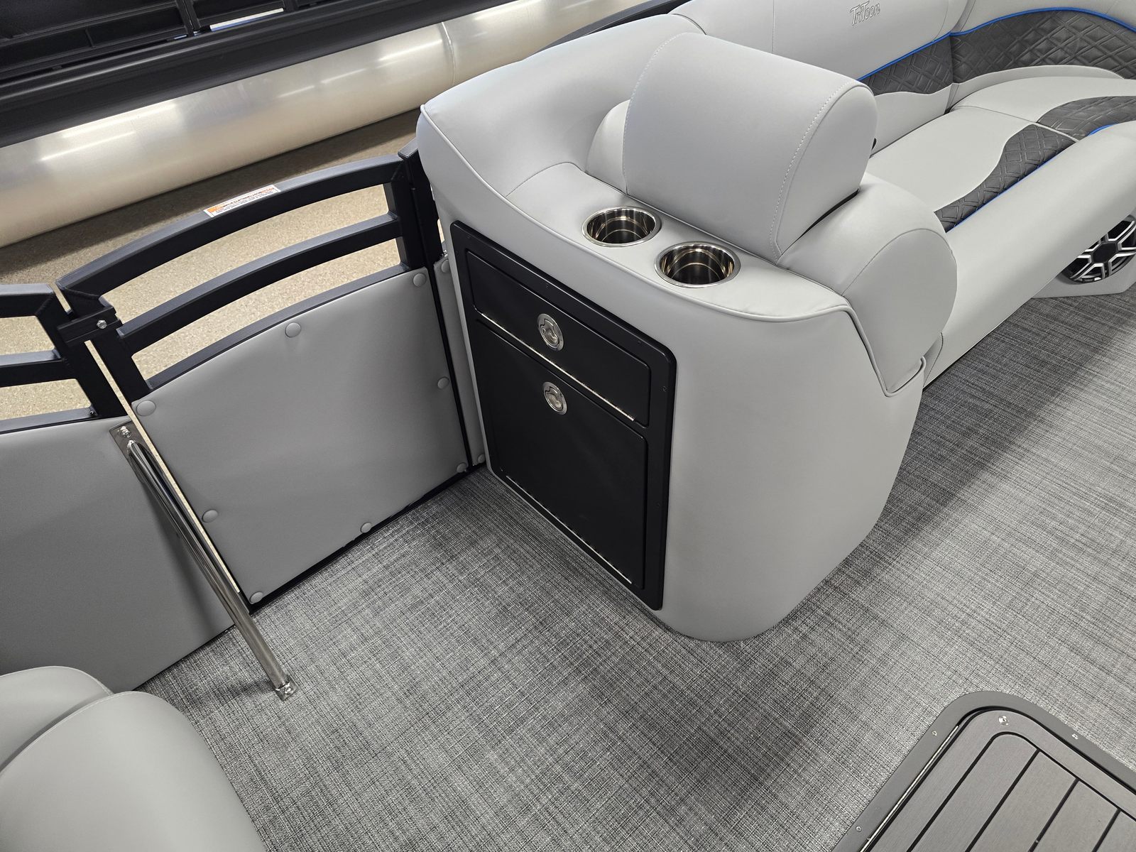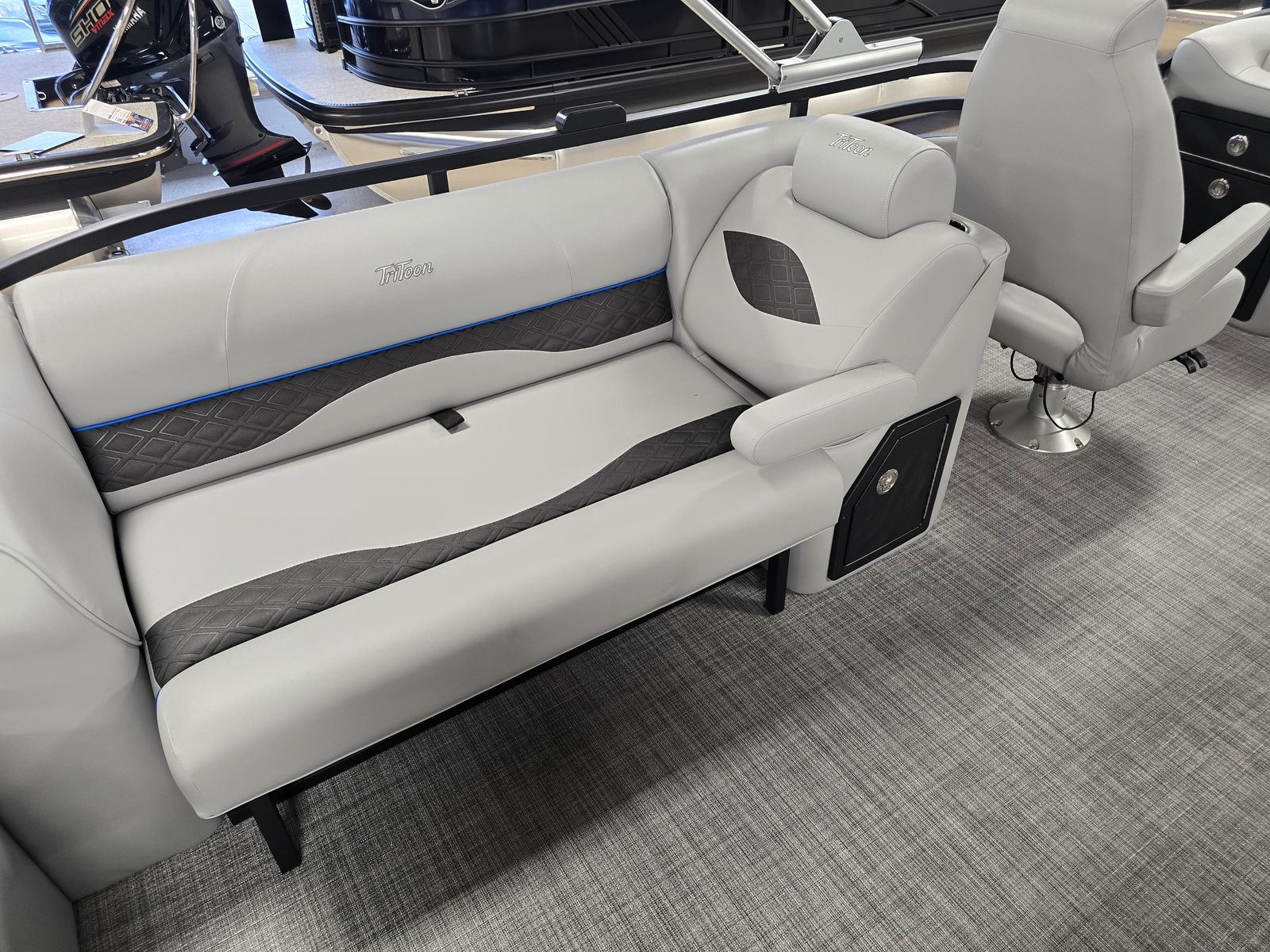 Step aboard and discover a world of comfort and convenience. The Jc Neptoon 23TT Sport features plush gray upholstery, accented with carbon quilted details for a sophisticated touch. The seat base panels in light blue add a refreshing pop of color, while the dual stern lounges invite you to relax in style. Both the port and starboard loungers come with integrated storage, providing practical solutions for stowing gear, towels, and personal items. The bimini top in sleek black offers shade on sunny days, and the rail color in black adds a modern, cohesive finish to the boat’s overall aesthetic.