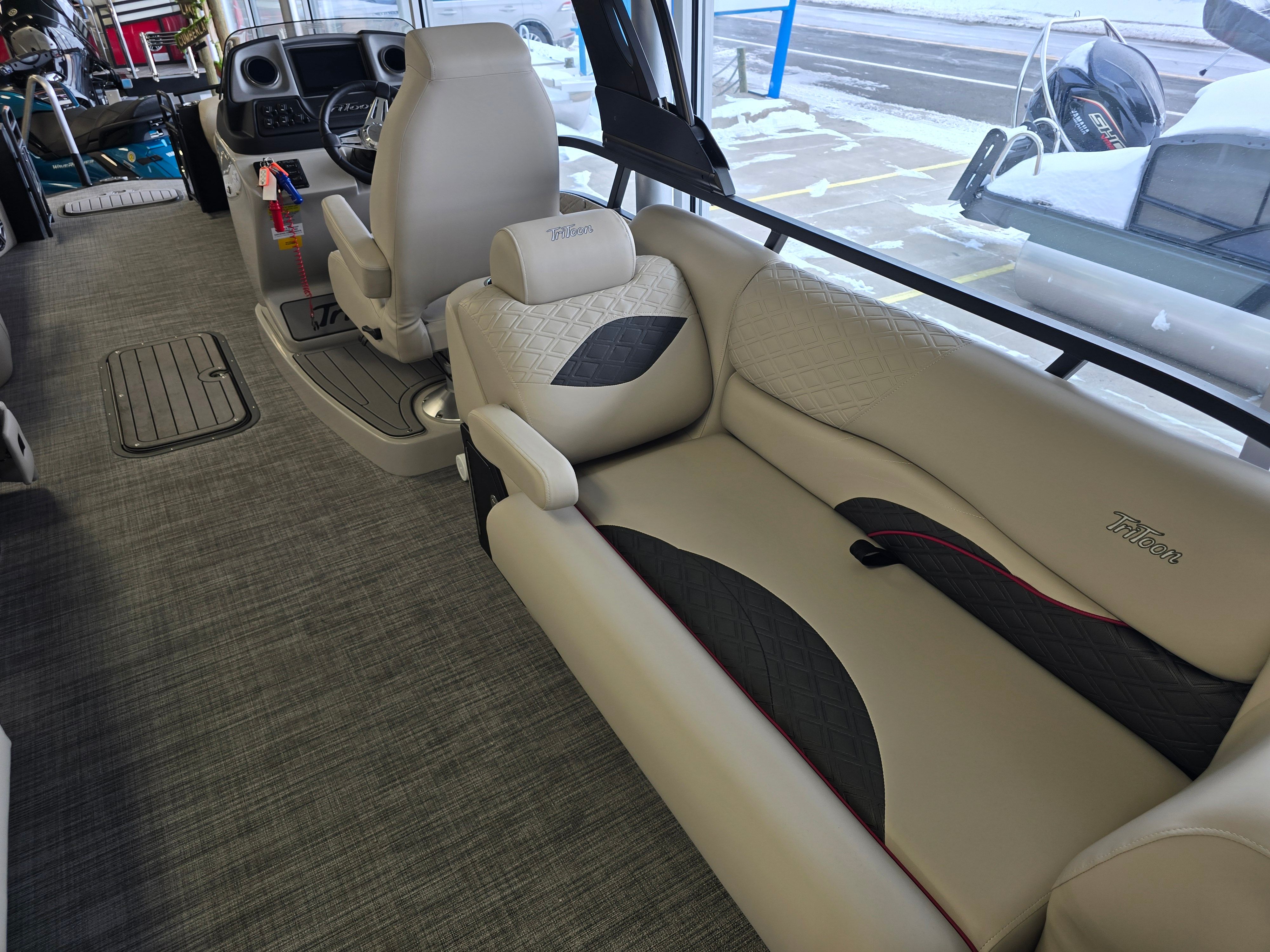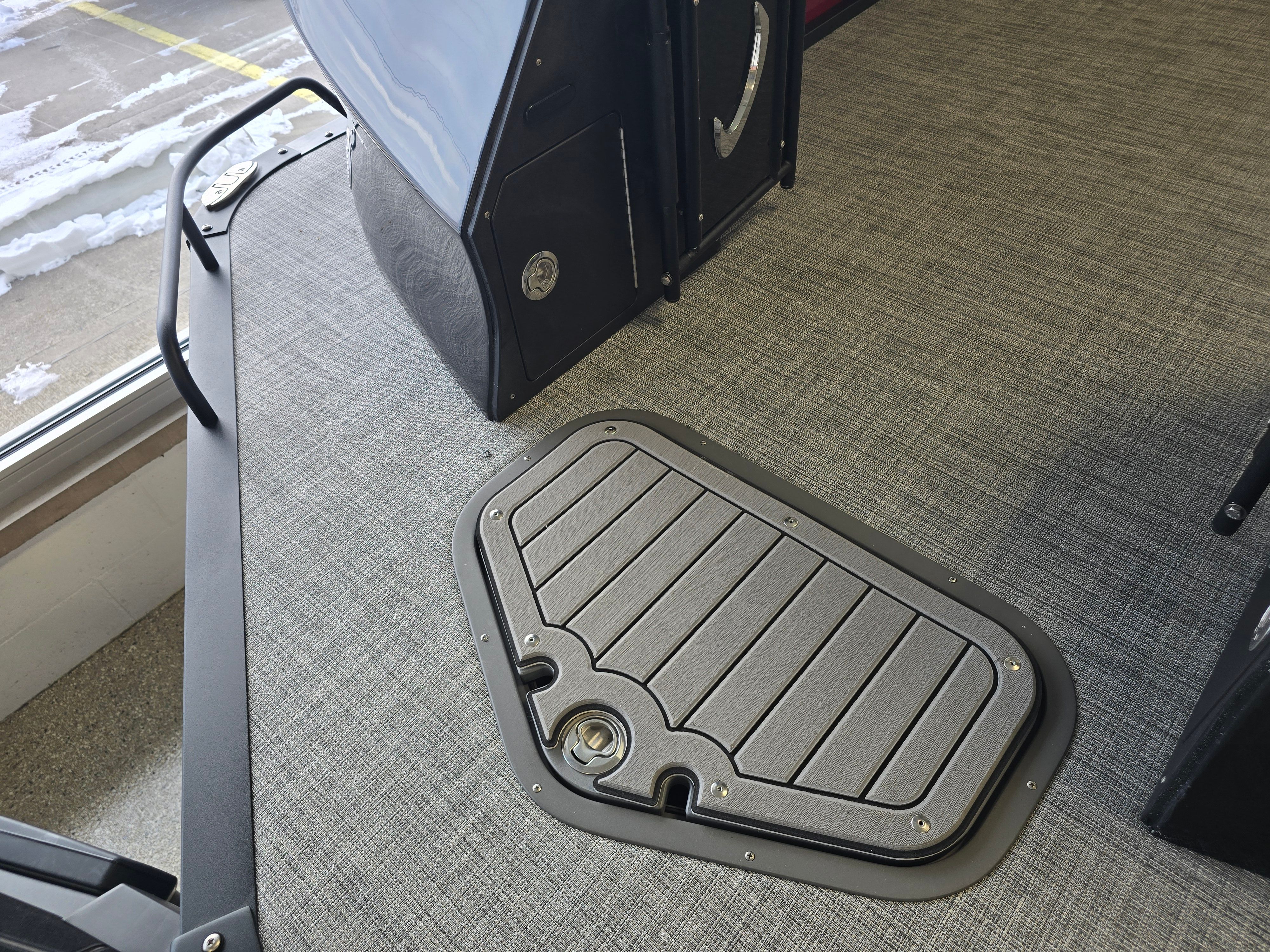 Step aboard the Jc Sporttoon 24TT and you’ll immediately notice its striking visual appeal. The upholstery base color in tan is complemented by carbon accents, creating a sophisticated and inviting atmosphere. The seat base panel color in burgundy adds a touch of elegance, while the black panels with burgundy lower panels provide a bold, modern look. Black rails further enhance the boat’s sleek appearance, and the black bimini offers shade and protection from the sun, allowing you to relax in comfort.The JC Grass Flooring in gray is both stylish and practical, providing a soft, slip-resistant surface that’s easy to maintain. Dual stern lounges invite you and your guests to stretch out and unwind, making every trip on the water a luxurious experience. The thoughtful layout ensures plenty of room for socializing, sunbathing, or simply enjoying the view. With no sundeck and no starboard gate, the design remains streamlined and uncluttered, maximizing usable space and enhancing the overall aesthetic.