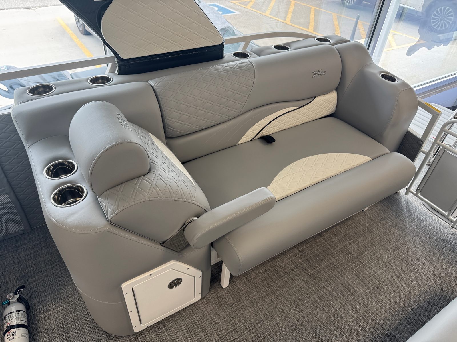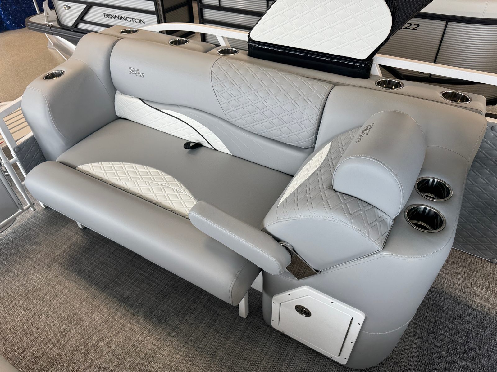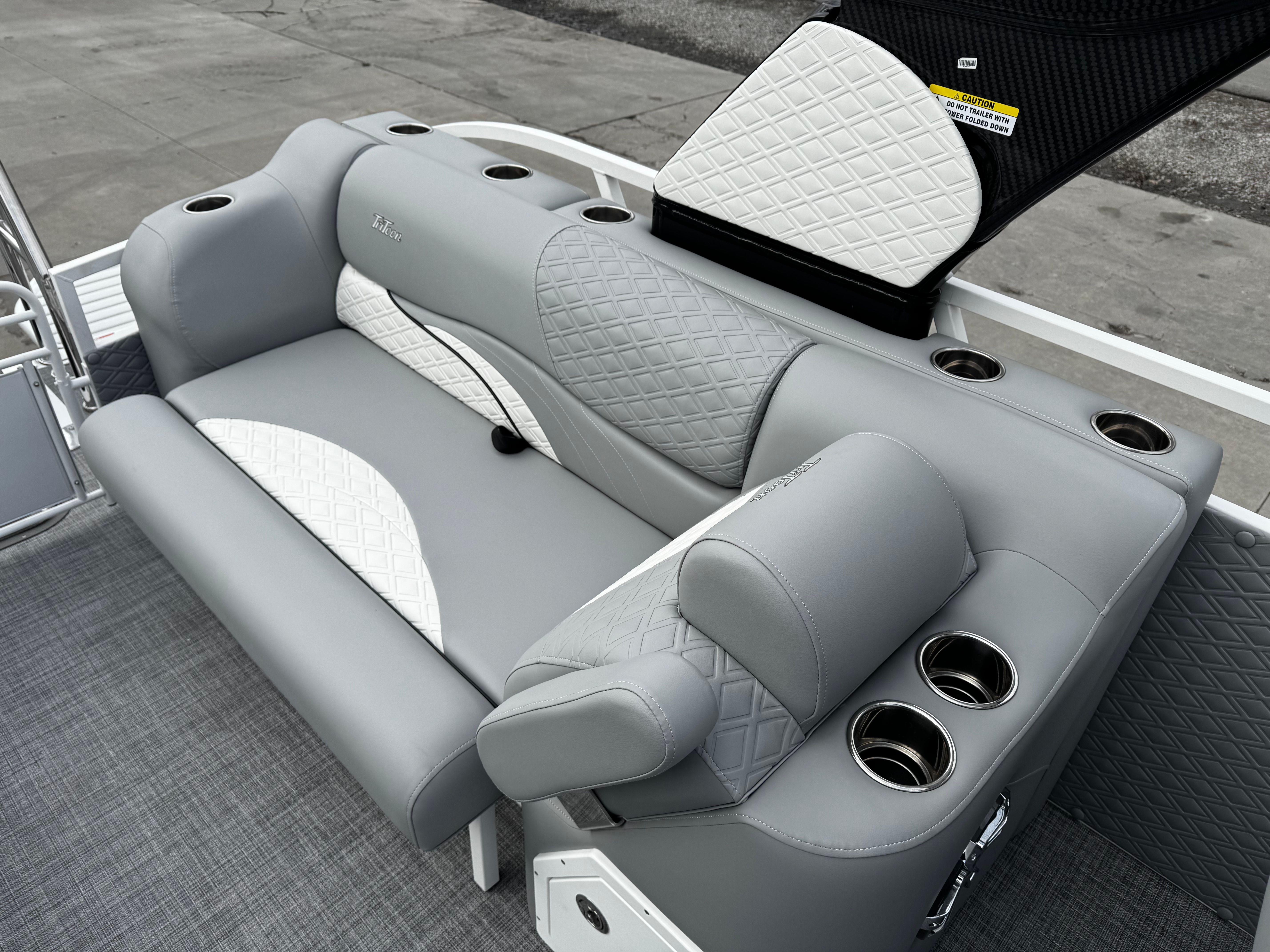 The Jc Sporttoon 26TT is packed with special features that set it apart from other pontoon boats for sale. The upholstery base color in gray, accented by a white base, creates a sophisticated and inviting atmosphere. Seat base panel colors in black, complemented by white panels with gloss black lower panels and striking white graphics, add a touch of modern elegance to the boat’s interior. The black bimini provides shade and protection from the sun, while the JC Grass flooring in gray offers both comfort and durability underfoot.White rails frame the boat, enhancing its sleek appearance and providing sturdy support. The dual stern lounges are a highlight, offering plush seating for relaxation and socializing. These lounges are perfect for enjoying the scenery, sharing conversations, or simply unwinding after a day of fun on the water. The absence of a sundeck and starboard gate streamlines the layout, maximizing usable space and creating an open, inviting environment for passengers.