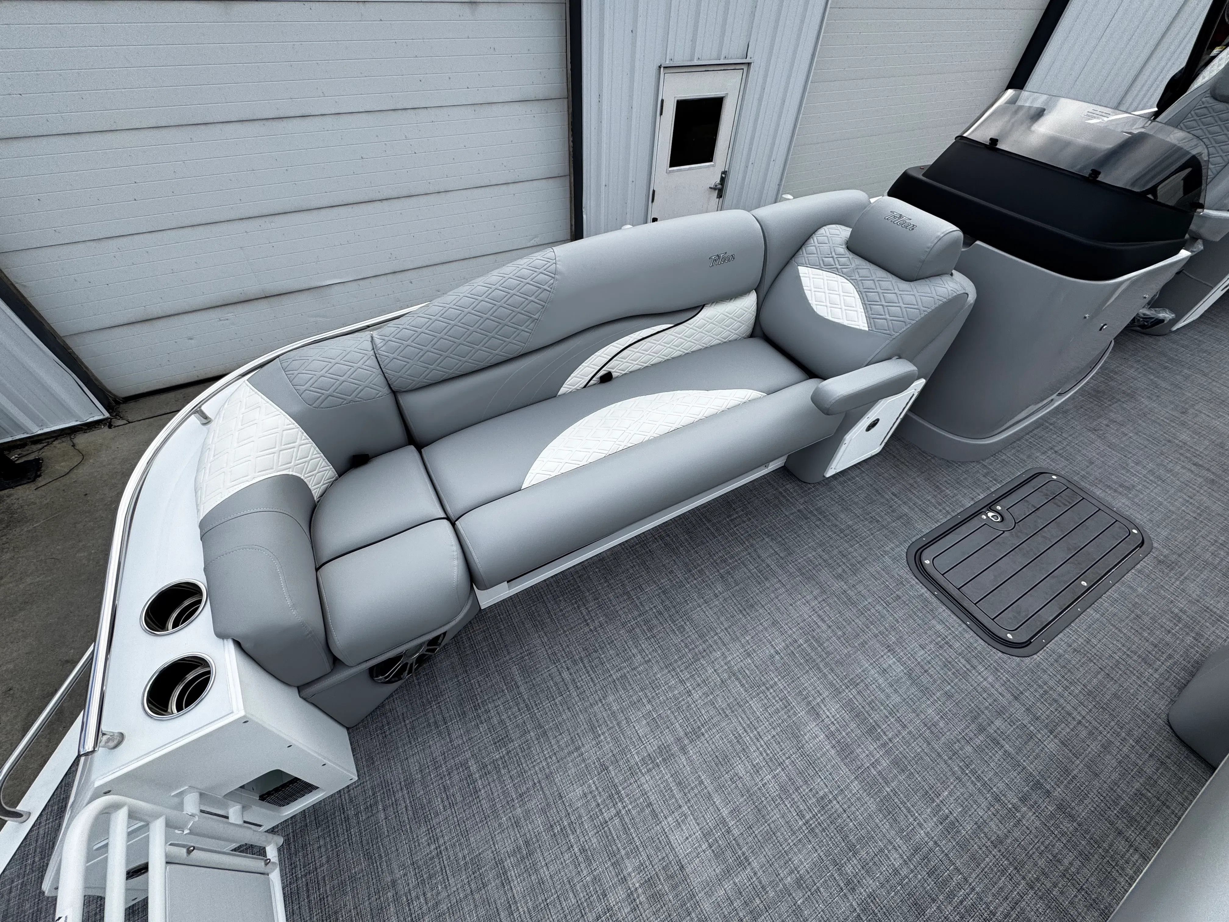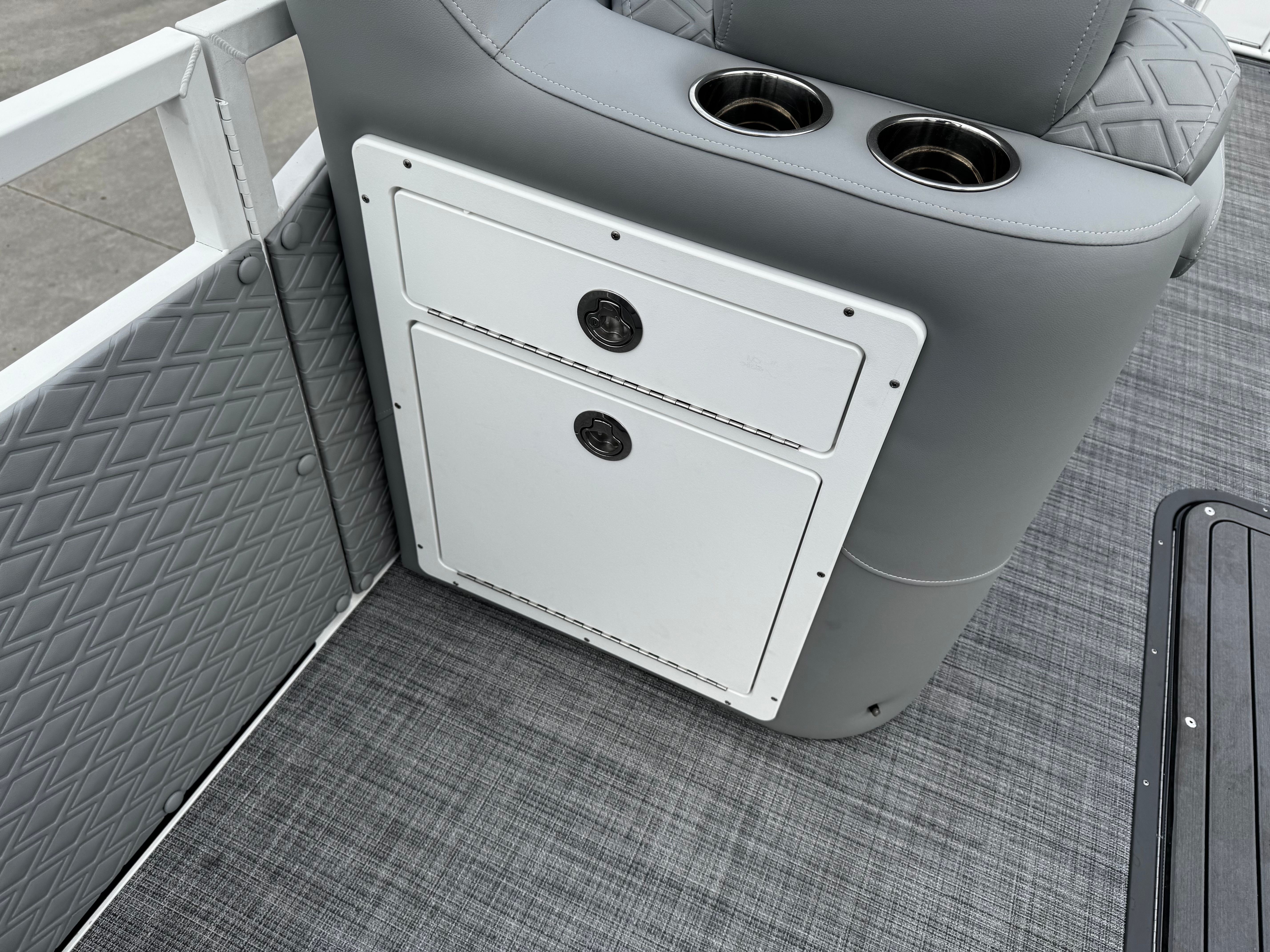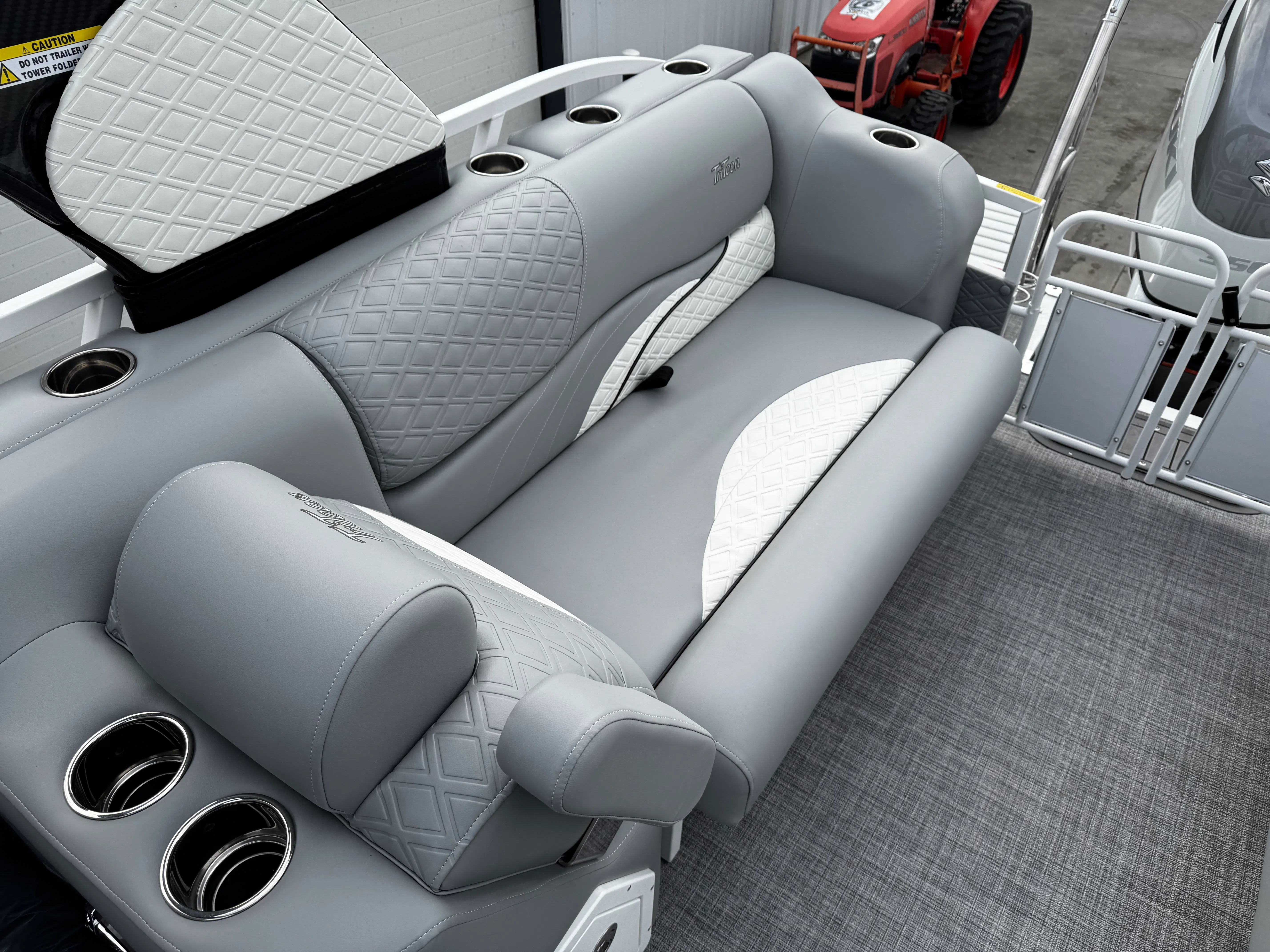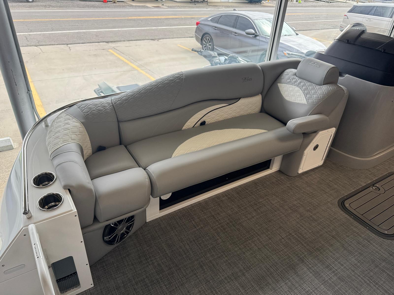 The Jc Sporttoon 26TT is packed with special features that set it apart from other pontoon boats for sale. The upholstery base color in gray, accented by a white base, creates a sophisticated and inviting atmosphere. Seat base panel colors in black, complemented by white panels with gloss black lower panels and striking white graphics, add a touch of modern elegance to the boat’s interior. The black bimini provides shade and protection from the sun, while the JC Grass flooring in gray offers both comfort and durability underfoot.White rails frame the boat, enhancing its sleek appearance and providing sturdy support. The dual stern lounges are a highlight, offering plush seating for relaxation and socializing. These lounges are perfect for enjoying the scenery, sharing conversations, or simply unwinding after a day of fun on the water. The absence of a sundeck and starboard gate streamlines the layout, maximizing usable space and creating an open, inviting environment for passengers.