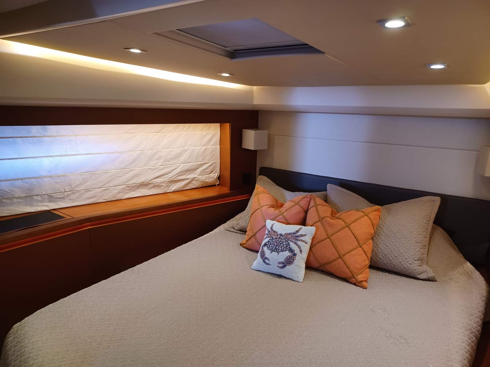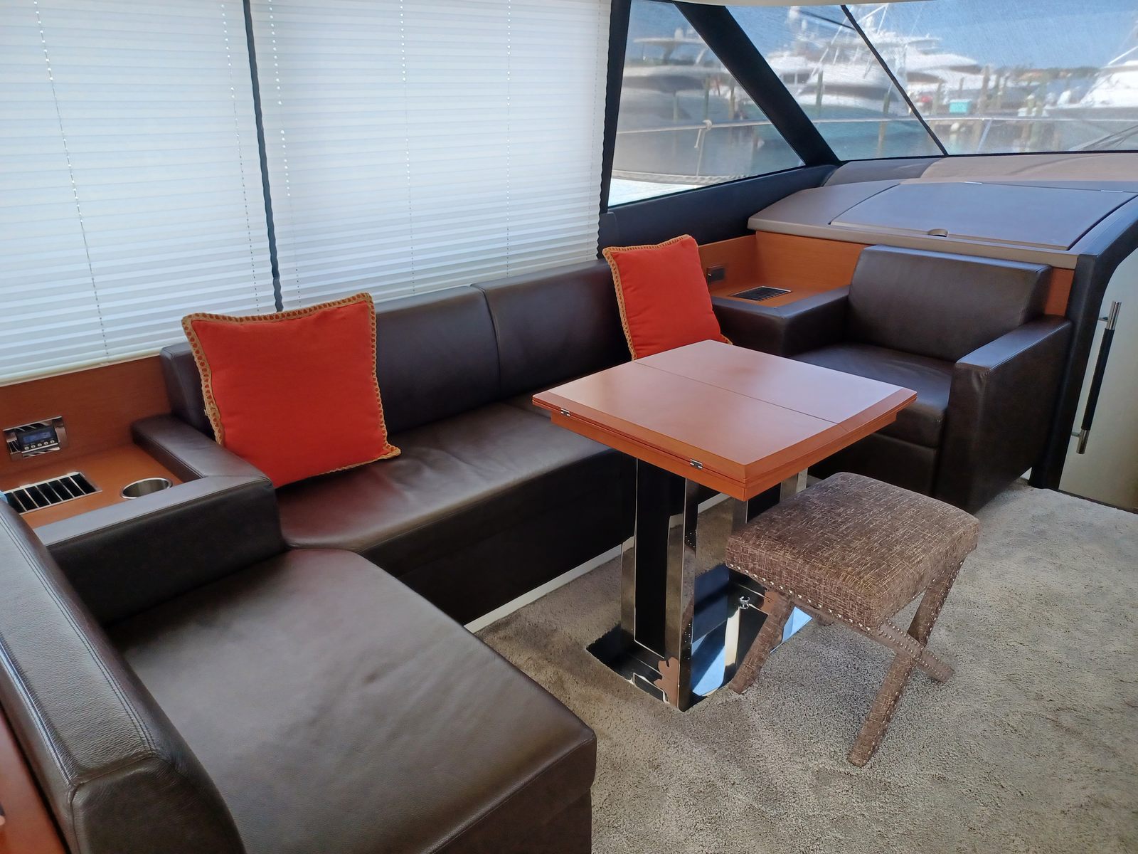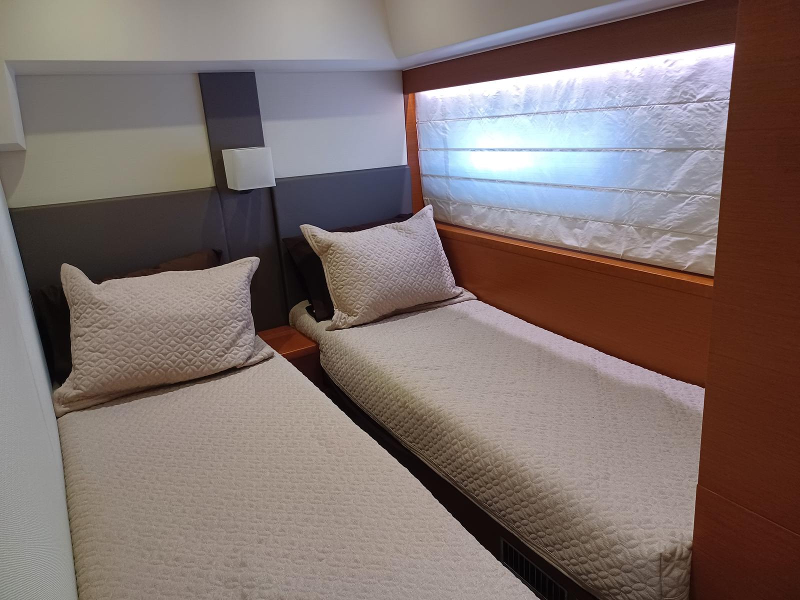The Prestige 550 Flybridge is a 3-stateroom, 2-head layout with a private master suite amidships with a private entrance from the guest quarters. The master has a spacious ensuite head with separate stall shower and a walk-in closet. There is a spacious VIP stateroom forward and a third guest stateroom with side-by-side single berths. These share the guest/day head which is equipped with a separate stall shower and electric freshwater flush head. Additionally there is a separate crew cabin and head accessible from the transom.