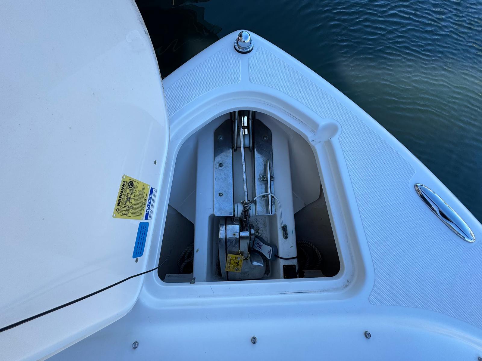 - Flush Mounted Integral Anchor Locker with Fiberglass Lid including: 316L Stainless Steel through Stem Anchor Roller with 8" Mooring Cleat, Chain Binder, 14 lb. Galvanized Plow Style Anchor, Self-Righting Shackle and 150' Rode (1/2" 8 Plait including 10' of ¼" G4 Chain)