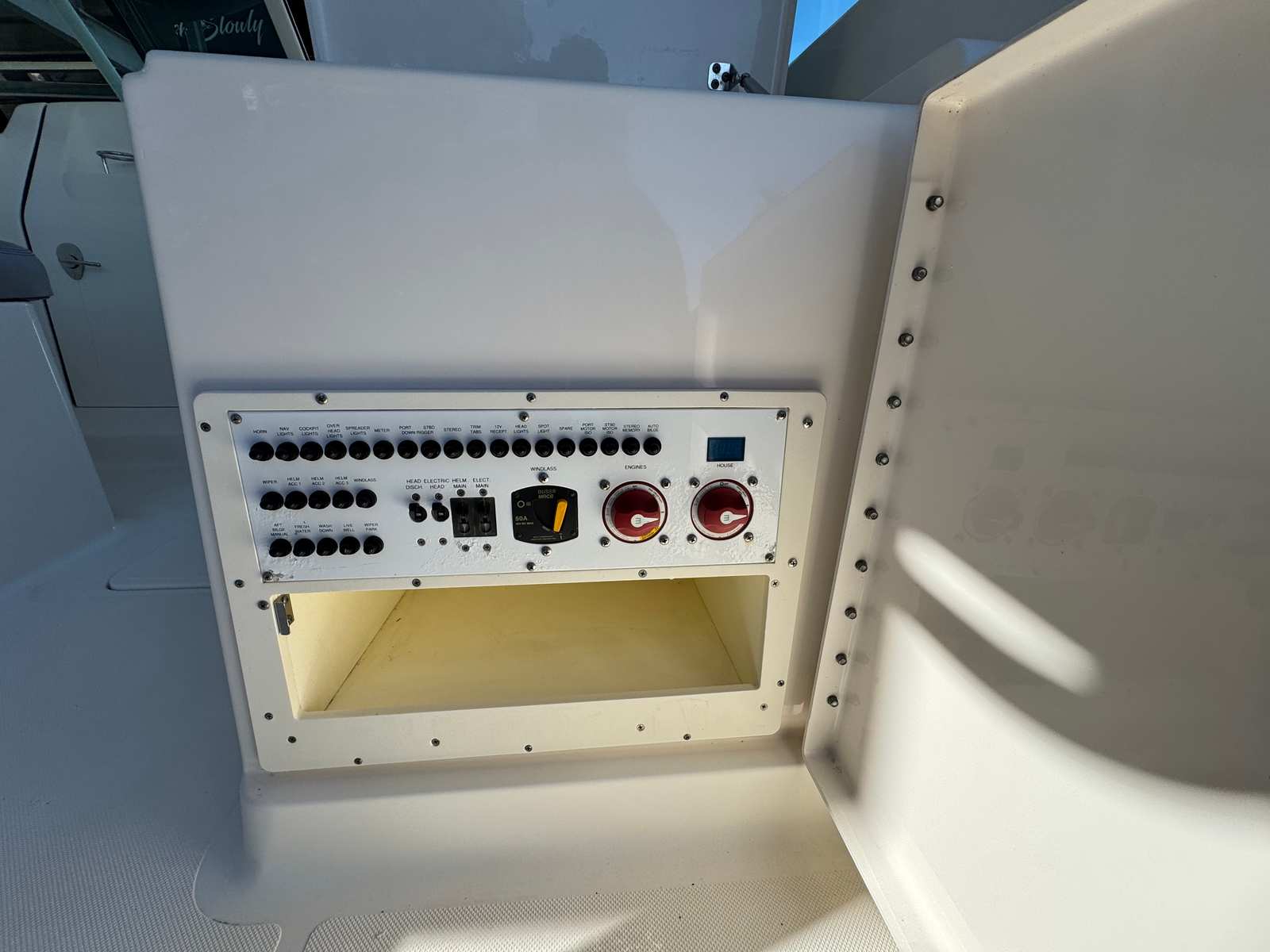 - Molded Fiberglass Lined Storage with Starboard Door under Helm