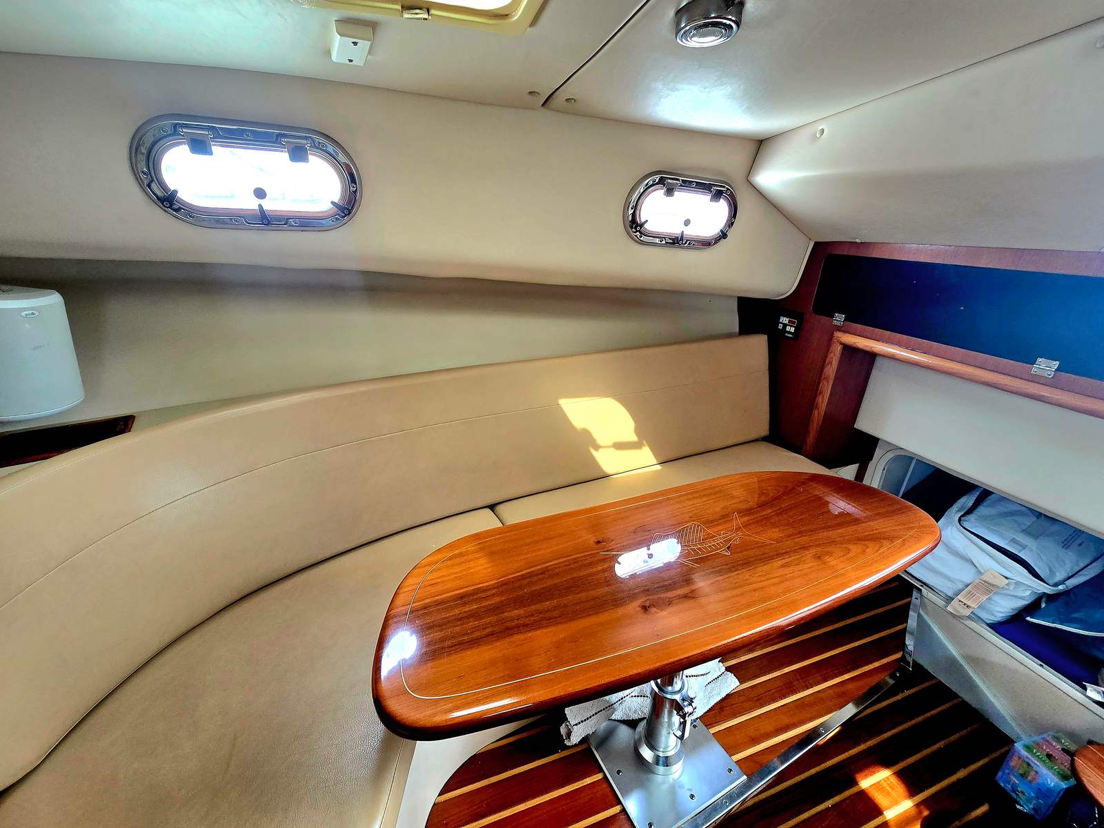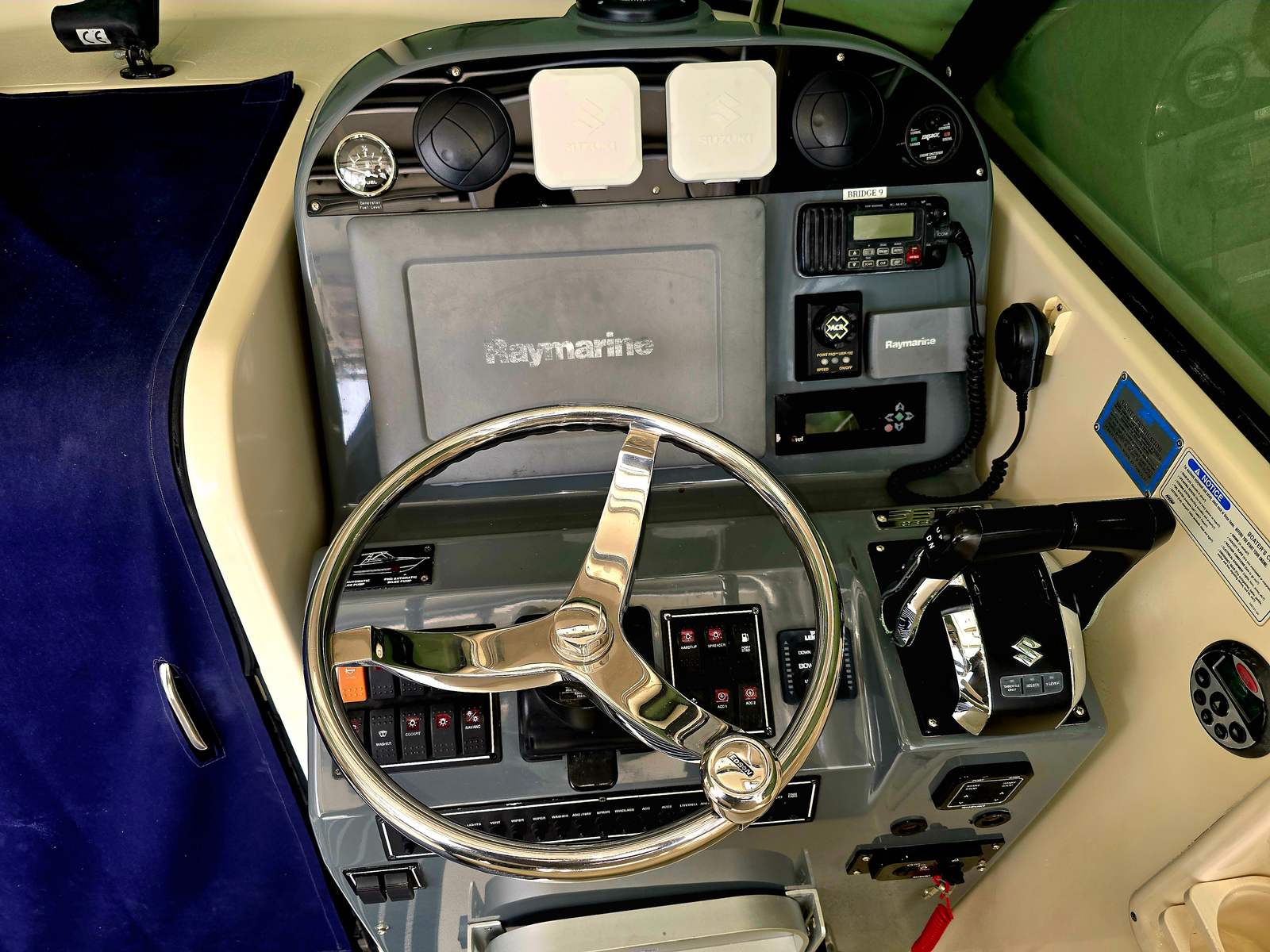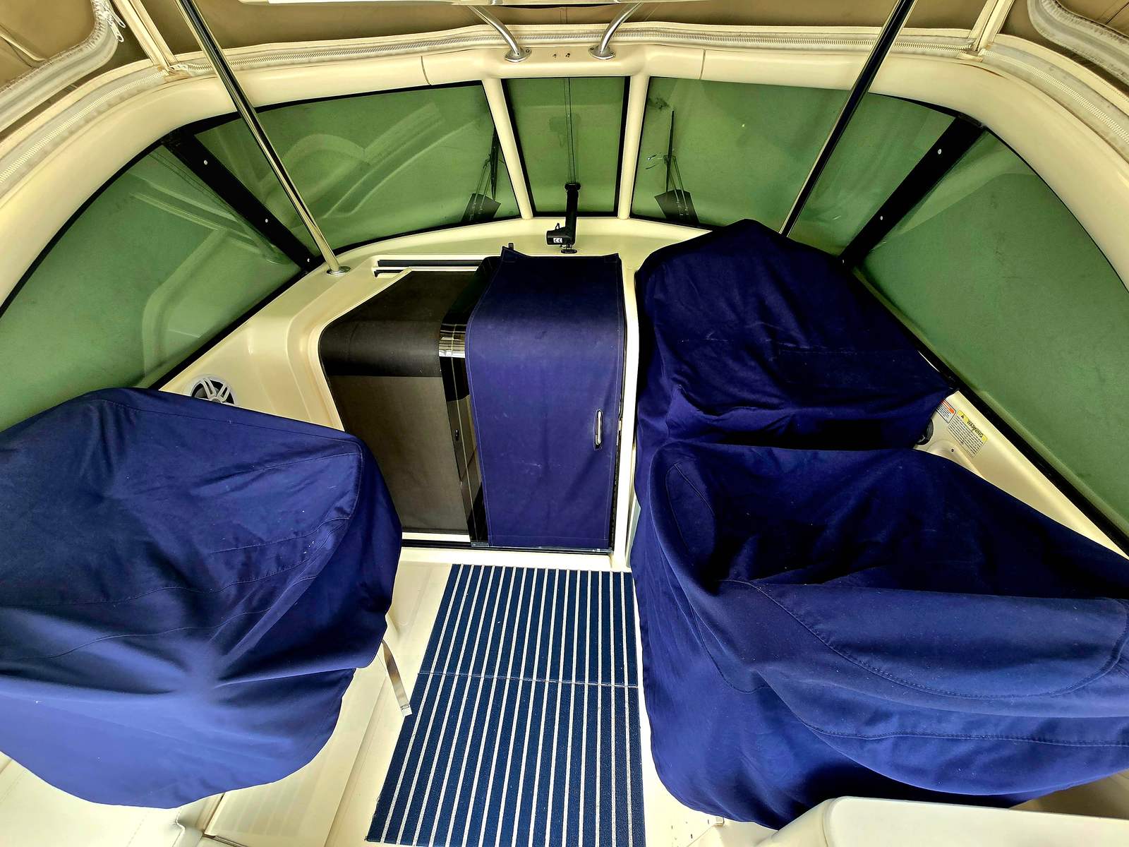 There is quite a bit of canvas with the boat; navy windshield cover, helm seat covers, dash cover, door cover, rear cockpit shade cover with poles. There is also a second anchor and rode in the front rope locker.