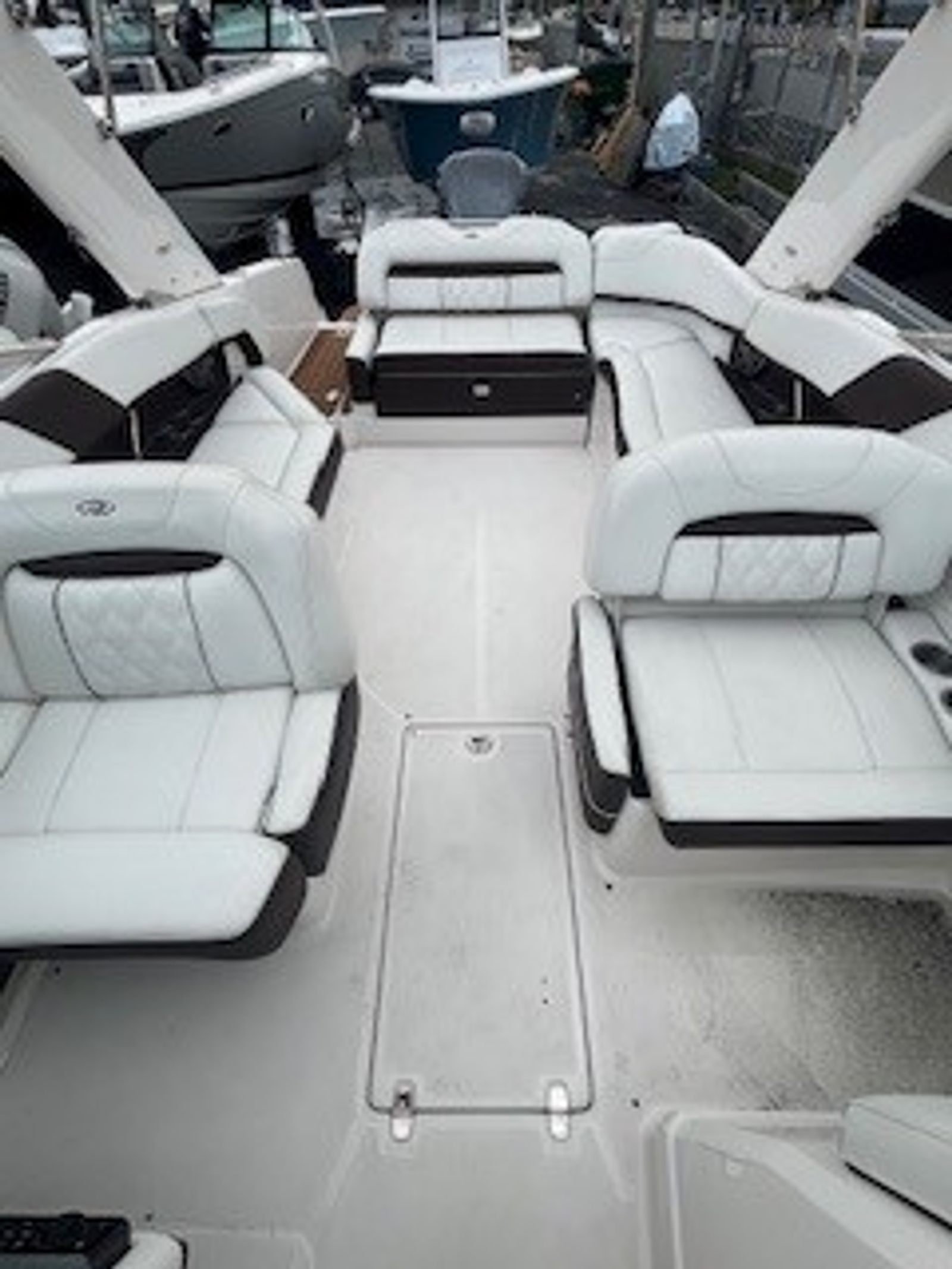 • Luxury Creature Comforts: Includes an enclosed compartment with an electric pump-out head (toilet), a Fusion Bluetooth marine stereo system with premium speakers, and a convenient refreshment center.