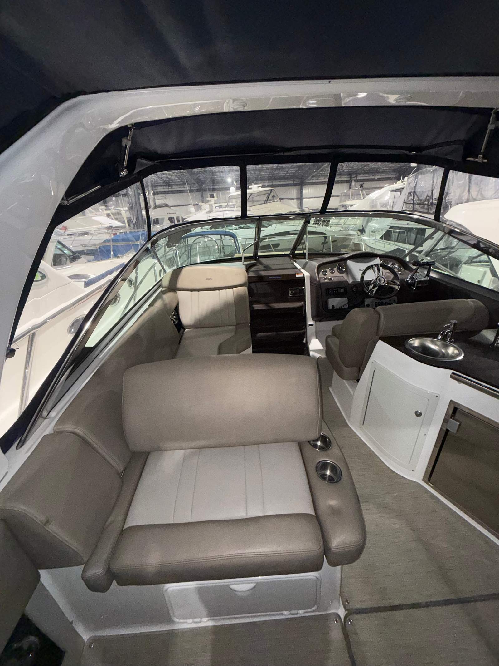 This cruiser boat for sale is equipped with a range of special features that enhance both comfort and convenience. The four onboard batteries ensure reliable power for all your electronics and amenities, while the battery charger keeps everything running smoothly during extended trips. The aft bench seat and aft cabin stateroom provide versatile seating and sleeping options, making it easy to accommodate family and friends for overnight stays or day cruises. Elegant cabinetry adds a touch of sophistication to the interior, offering practical storage solutions for your gear and personal items.The camper enclosure, featuring navy canvas that is only three years old, offers protection from the elements and extends your boating season. The cockpit carpet adds a layer of comfort underfoot, while the ample cockpit storage keeps your space organized and clutter-free. These features combine to create a welcoming environment that’s perfect for entertaining, relaxing, or simply enjoying the beauty of the water.