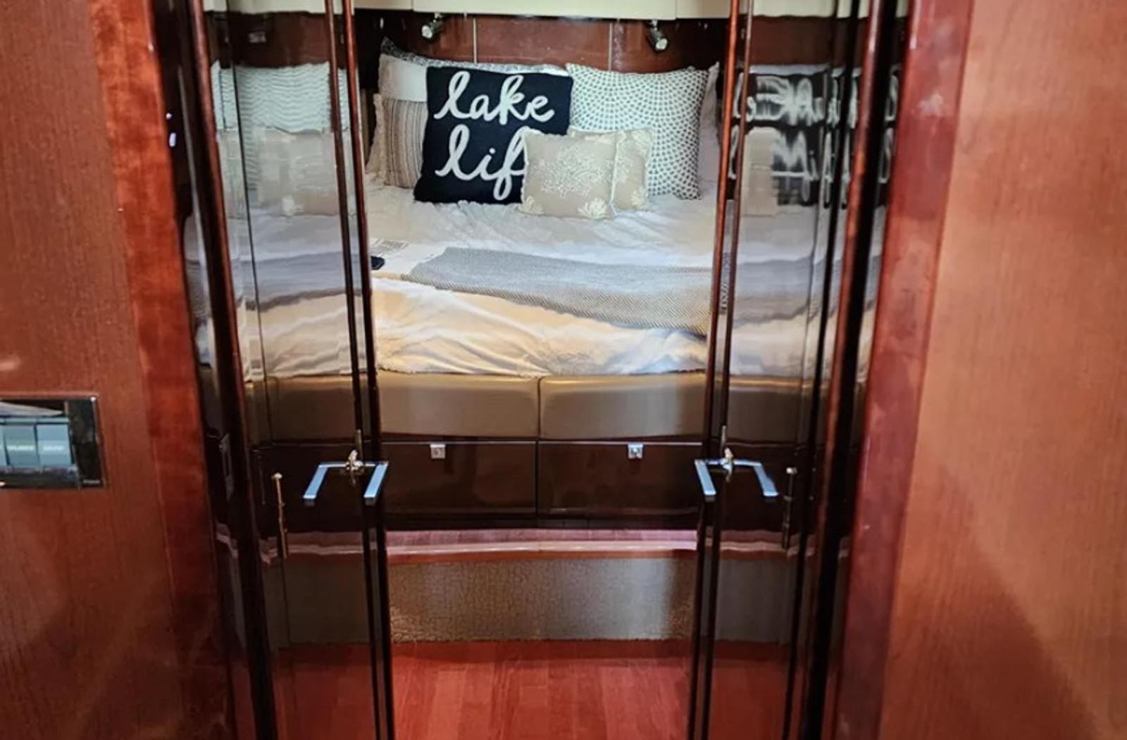 The galley is fully equipped for extended stays, featuring a two-burner stove, microwave/oven combo, oversized sink, Corian countertops, abundant cabinetry and drawers, and a new full-size refrigerator and freezer. The interior layout offers two staterooms and two heads. The master suite includes a queen berth with upgraded gel topper, dual cedar-lined closets, and a private head with separate shower and vanity. The guest stateroom features a convertible twin-to-queen berth, private head with shower and sink, a closet, and ample storage.