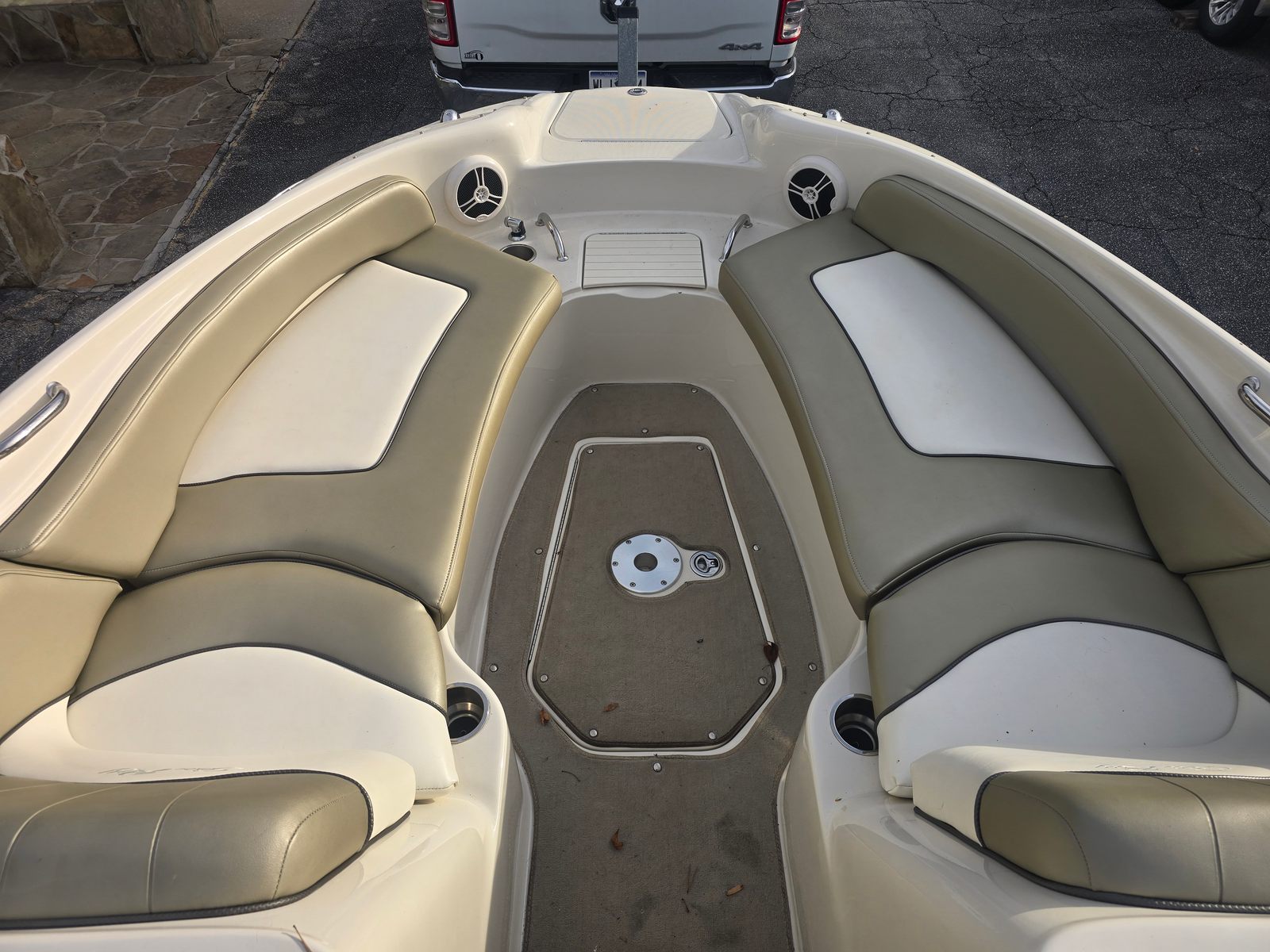 Practicality is at the heart of the Sea Ray Sundeck 240’s appeal. Its manageable size makes docking and maneuvering a breeze, even for those new to boating. The efficient engine ensures you can enjoy extended outings without worrying about excessive fuel consumption. Ample storage compartments throughout the deckboat provide convenient spaces to stow gear, water toys, and personal items, keeping the deck clutter-free and organized. The durable construction and reliable performance mean you can count on this Sea Ray boat for sale to deliver worry-free adventures season after season.