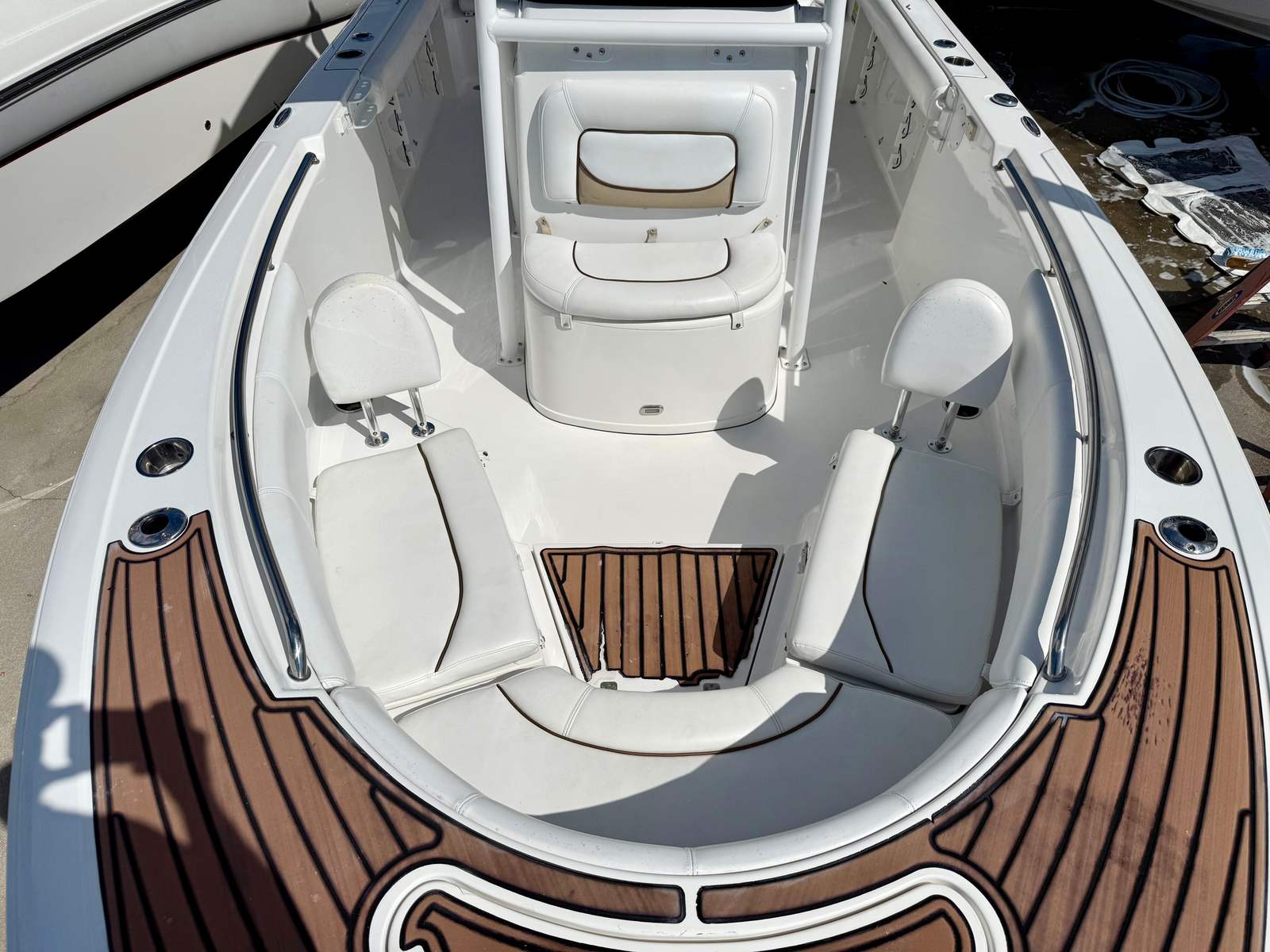 At the helm, you’ll find a Garmin 12-inch navigation display with sonar, providing clear, easy-to-read charting and fish-finding capabilities, along with a Garmin dome radar to enhance visibility and safety when navigating in low-light or changing weather conditions. The boat is also equipped with a jackplate, allowing for improved performance, shallow-water capability, and fine-tuned trim while underway.